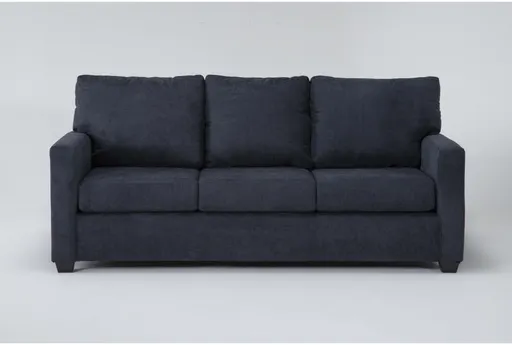 Experience the comfort and style of the Aramis Midnight Blue Fabric 83" Sofa. Designed with modern aesthetics in mind, this sofa features track arms and tapered legs for a contemporary appeal. The deep navy color adds a rich, inviting touch to your living room.