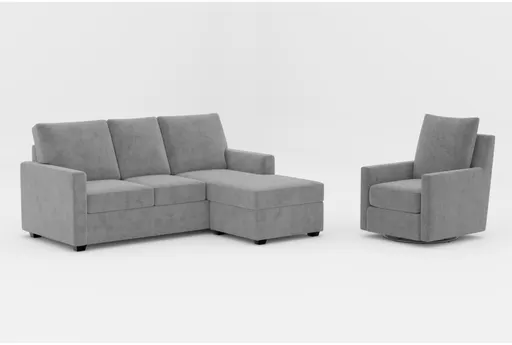 The Aramis Vintage Grey Fabric Queen Memory Foam Sleeper Sofa Bed with Reversible Chaise is a stylish and versatile addition to any living room. Its modern design and comfortable polyester fabric ensure it will be a favorite spot for relaxation. The included Bonaterra Natural Charcoal Grey Fabric Swivel Glider Arm Chair complements the set perfectly.