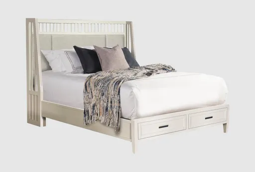 Introducing the Arris White King Wood & Upholstered Wingback Shelter Platform Bed with Storage. This bed combines a casual style with a soft cotton color, making it a perfect addition to any bedroom. The platform design includes convenient storage drawers, providing both functionality and a sleek look.