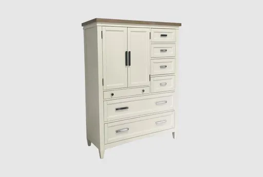 The Arris White Wood 7-Drawer 2-Door Bedroom Wardrobe Closet combines casual style with practical storage solutions. Finished in a soft cotton color, this wardrobe closet is made of birch veneer and solid poplar wood, ensuring durability and longevity. Perfect for organizing your bedroom, it features both drawers and doors for versatile storage options. Includes 7 drawers and 2 doors for ample storage. Features a hanging rod for clothing organization. Constructed from birch veneer and solid poplar wood.