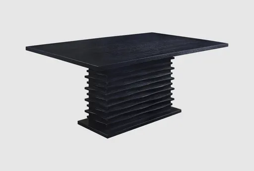 The Artemis Black Wood Pedestal Rectangular 65" Dining Table is a modern statement piece that pairs a long rectangular top with a bold stacked pedestal base. A textured black finish highlights natural wood grain and subtle paneling, giving the table architectural presence without fuss. Designed to seat six comfortably, the 65 inch surface provides room for family-size dining and generous serving setups. Precision joinery and reinforced internal bracing deliver structural integrity so the table feels steady during everyday use and entertaining.