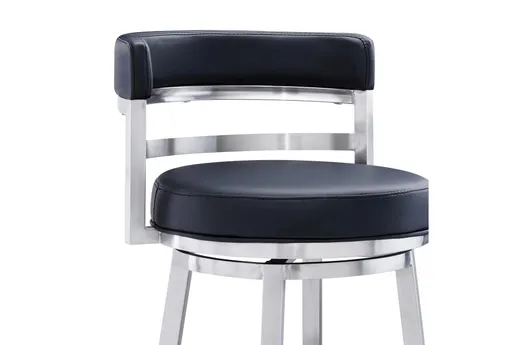 The Artesa 30" Bar Height Swivel Barstool combines modern design with mid-century modern elements, featuring a sleek black faux leather seat and a brushed stainless steel frame. This stylish barstool is perfect for any contemporary kitchen or dining area, offering both comfort and functionality with its 360-degree swivel feature.