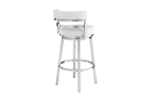 The Artesa 30" Bar Height Swivel White Faux Leather + Brushed Stainless Steel Barstool is a modern addition to any dining room or kitchen. Featuring a sleek armless design, this barstool offers both style and comfort. The swivel function adds convenience, making it perfect for social settings.