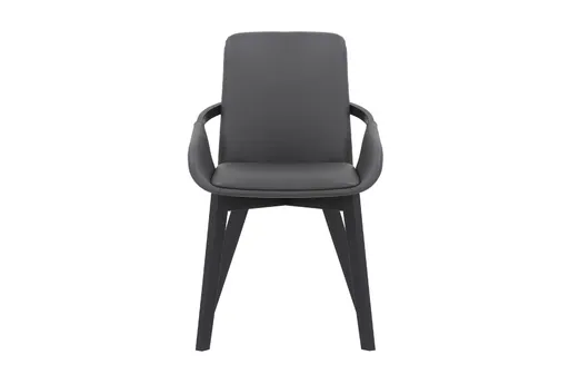 The Arty Modern Grey Wood Dining Room Chair pairs a gently curved silhouette with a supportive, foam-padded seat to create a comfortable spot for meals and conversation. It is upholstered in grey faux leather and sits on tapered wood legs reinforced with metal for reliable stability. The open, rounded arms and compact footprint make it easy to tuck under a table or use as an occasional desk chair in a dining room or small dining nook.