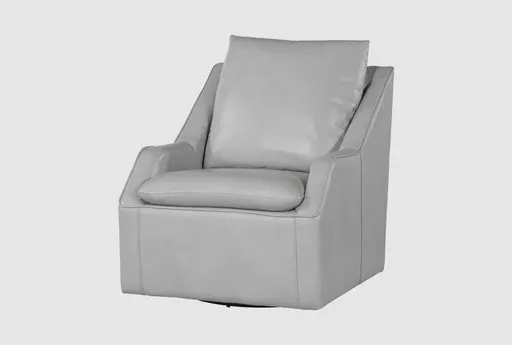 The Asher Steamboat Ice Swivel Accent Chair brings compact, modern comfort to small spaces with a curved, low-back silhouette that reads light in a room. Upholstered in leather seating (leather match) in soft light grey with subtle white accents, it pairs a tailored welted edge with removable seat and back cushions for easy care. A metal swivel base and discreet block base support smooth rotation while preserving a small footprint, making this a smart modern living room furniture choice and a small space solution for studio apartments. Dacron wrapped foam and foam core seats deliver plush but supportive comfort, and polyurethane trim reinforces high-contact edges for lasting appearance.