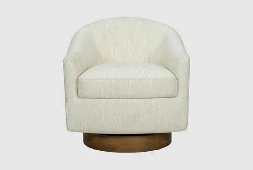 The Ashton Cream Beige Upholstered Swivel Chair with Wood Base offers a perfect blend of modern style and comfortable design for your living room. Its neutral cream color and curved shape make it a versatile addition to any decor, while the wood base provides stability and a touch of natural warmth. Features a swivel design for easy movement. Crafted from 100% polypropylene fabric. Neutral cream color complements various interior styles.