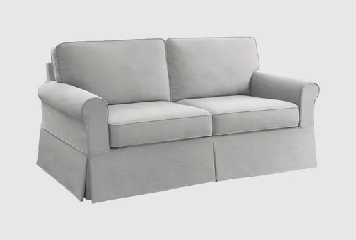 The Ashton Fog Grey Fabric 77" Skirted Sofa combines traditional elegance with a touch of farmhouse charm. Upholstered in a high-performance fabric, this sofa features a soft and relaxed designer style, perfect for any living space. The firm comfort level ensures lasting support, while the piping detail and flirty kick pleat skirt add a sophisticated touch.