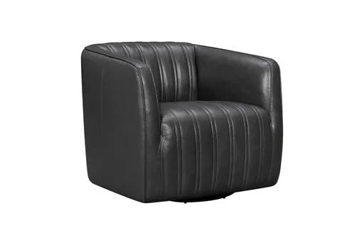 Asrie Pewter Genuine Leather Swivel Barrel Chair blends casual barrel proportions with vertical channel stitching for a modern take on comfortable seating. Upholstered in 100% pewter leather over a wood frame with foam cushioning and a metal swivel base, it delivers supportive seating that keeps its shape. The compact round design fits easily into living rooms and great rooms while the smooth 360 degree swivel makes it simple to follow conversations.