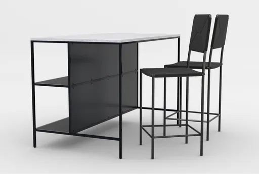 The Atacama Kitchen Island pairs a white engineered stone top with a matte black metal frame to create a compact prep and serving surface that also accommodates seating. A sturdy metal frame and engineered wood shelves give accessible storage for cookware and serveware while the engineered stone top resists everyday wear and provides a solid food prep surface. Two 26-inch counter-height stools with black rattan seats tuck under the island for casual dining or extra workspace.