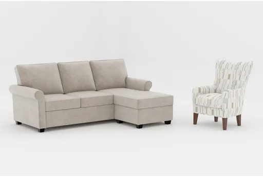 Experience the perfect blend of style and functionality with the Athos Cream Beige Fabric Queen Memory Foam Sleeper Sofa Bed with Reversible Chaise and Camille White Fabric Modern Wingback Arm Chair with Dark Walnut Finish. This set is designed to enhance your living room with its casual charm and practical features.