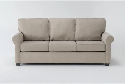 The Athos 86-inch sofa brings timeless comfort to casual living spaces with classic rolled arms and a cream beige fabric cover that complements a neutral palette. Piped edges and tapered legs give the profile a refined traditional silhouette while remaining approachable for modern living room furniture. Loose, reversible back cushions pair with supportive foam seat cushions to deliver a medium, medium-firm feel that suits daily lounging, watching tv, or hosting guests. The 3-person scale fits larger rooms and serves as a small space solution in apartments when arranged as the main seating area.