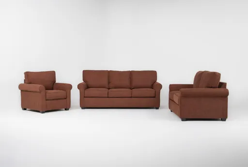 Athos II Cinnamon 86" 3 Piece Sofa Loveseat & Chair Set brings relaxed, casual seating to the living room with a coordinated sofa, loveseat and chair. Upholstered in 100% polyester fabric in a warm cinnamon tone, the set features supportive seat cushions and removable back cushions for easier care. The 86-inch sofa includes a sturdy frame and wide track arms deliver dependable everyday support. Picture movie nights and visiting family gathered on a set that balances comfort and practical function.