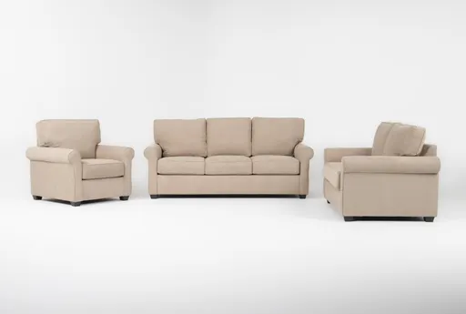 Athos II Sand 86" 3 Piece Queen Sleeper Sofa Loveseat & Chair Set offers roomy, comfortable seating for everyday living and a queen-size sleep surface for guests. The casual silhouettes and plush cushions are upholstered in 100% polyester fabric that stands up to high-traffic living rooms while remaining soft to the touch. The sofa's easy pull-out queen-size sleeper creates a convenient bed, and the three-piece grouping lets you arrange seating to fit your space.