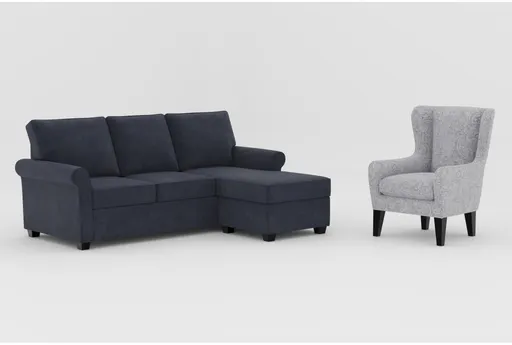 Athos Midnight Blue Fabric 86" Queen Memory Foam Sleeper Sofa Bed with Reversible Chaise|Anabelle II Grey Fabric Wingback Armchair With Espresso Finish