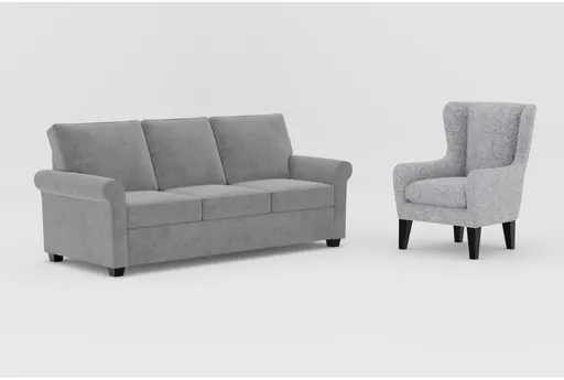 The Athos Vintage Grey Fabric 86" Queen Memory Foam Sleeper Sofa Bed and Anabelle II Grey Fabric Wingback Arm Chair with Espresso Finish are perfect additions to your living room. The casual style and vintage grey color create a welcoming and comfortable atmosphere. Both pieces are upholstered in 100% polyester fabric, ensuring durability and easy maintenance.
