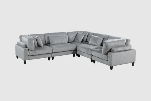 Introducing the Atra Grey Corduroy 5 Piece Modular Sectional, designed for the modern living room. This symmetrical sectional features loose reversible back cushions and is upholstered in soft corduroy fabric. The grey color and natural wood legs add a neutral touch to any decor.