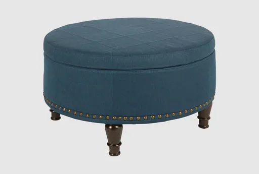 Introducing the Augusta Round Wood Storage Ottoman in Klein Azure Fabric, a perfect blend of style and functionality. This traditional ottoman features a rich azure color and is made with 100% polyester fabric. Ideal for living rooms and entryways, it offers both seating and storage solutions.