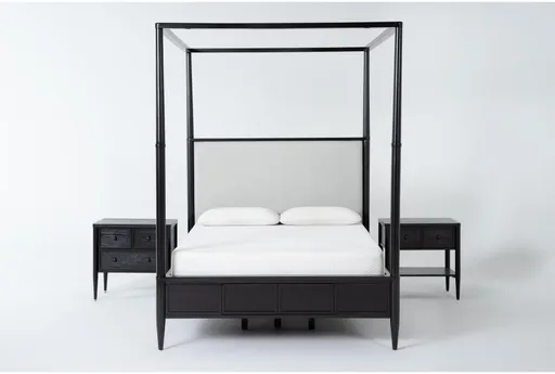 Transform your bedroom into a luxurious retreat with the Austen Black California King Side Storage Wood & Upholstered Platform Canopy 3 Piece Bedroom Set With 1-Drawer & 3-Drawer Nightstands by The Essentials. This stunning set features a sophisticated canopy bed with side storage, providing both style and functionality. Enjoy the blend of oak veneer and solid rubberwood, complemented by plush fabric upholstery for a comfortable and stylish finish.