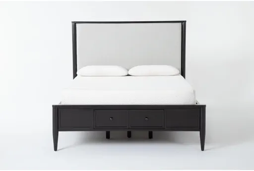 Introducing the Austen Black California King Wood & Upholstered Platform Bed, perfect for those who appreciate traditional style and functionality in their bedroom. This bed combines solid rubberwood and oak veneer with a sleek black finish, offering ample storage with its side and footboard drawers. Ideal for modern farmhouse or urban rustic themes, this bed is designed to keep your space organized and stylish.