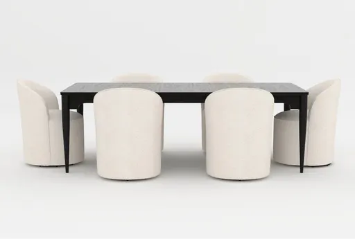 Enhance your dining experience with the Austen Black 72-90" Extendable Dining Table and Mira Barrel Upholstered Armless Side Chair Set for 6. This traditional black dining table, made from oak veneer and solid rubberwood, provides both durability and style. The set includes an extendable rectangular table with tapered legs and six comfortable armless side chairs finished in soft fabric.