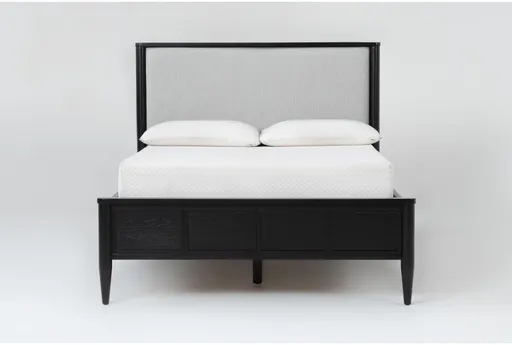 The Austen Black Full Wood Upholstered Platform Bed pairs a classic panel silhouette with a clean, symmetrical profile, making it a versatile focal point for kids rooms, dorms, or apartment bedrooms. A soft fabric upholstered headboard in grey provides comfortable back support for reading in bed or watching tv, while tapered legs and a textured black oak veneer give the frame a refined, light visual presence. The platform design uses a slat support system for reliable mattress support so no box spring is needed, which makes this bed a practical small space solution. It complements modern living room furniture accents and neutral palettes, and the durable upholstery stands up to everyday use in shared living spaces.