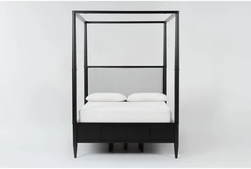 As part of a complete whole-home collection that was developed entirely by Living Spaces, the Austen canopy bed reflects a unique and thoughtful approach to design. With a refined all-American look and extensive functionality, this piece is a natural and purposeful addition to your bedroom. A textured black finish accentuates oak veneer and solid wood, while an upholstered headboard provides soft support. Stately and elegant, long, turned and tapered posts distinguish the frame. We offer options with and without storage, so you can enjoy no storage, side storage, footboard storage, or side and footboard storage.