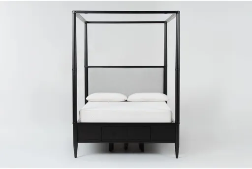 Introducing the Austen Black Full Wood Upholstered Platform Canopy Bed, a perfect blend of traditional style and modern functionality. This striking black bed features a sturdy rubberwood frame that promises durability and sophistication. The bed is designed with a canopy, platform, and storage drawers, making it a practical and stylish addition to any bedroom.