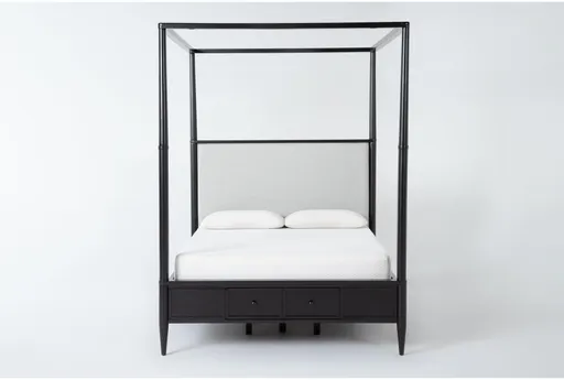 As part of a complete whole-home collection that was developed entirely by Living Spaces, the Austen canopy bed reflects a unique and thoughtful approach to design. With a refined all-American look and extensive functionality, this piece is a natural and purposeful addition to your bedroom. A textured black finish accentuates oak veneer and solid wood, while an upholstered headboard provides soft support. Stately and elegant, long, turned and tapered posts distinguish the frame. We offer options with and without storage, so you can enjoy no storage, side storage, footboard storage, or side and footboard storage. Cedar-lining in the drawers repels moths and insects, and keeps clothes fresh by eliminating mildew.