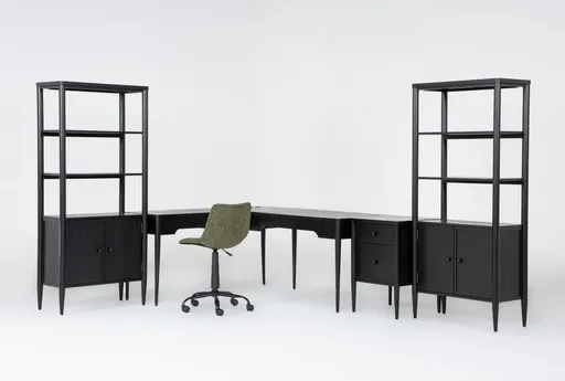 As part of a complete whole-home collection that was developed entirely by Living Spaces, the Austen L-shaped lift-top desk reflects a unique and thoughtful approach to design. With its refined all-American look and extensive functionality, the piece is a natural and purposeful addition to your workspace. A textured black finish accentuates oak veneer and solid wood, while long, turned and tapered posts add elegance. In addition to a storage drawer and USB, the desk boasts a lift-top design that allows you to adjust your height and work while standing. The file, bookcases and Rhea Green office chair create a complete office set.
