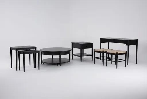 The Austen Black Traditional 6 Piece 40" Round Lift-Top Coffee Table Set is a versatile and stylish addition to any living space. This set includes a console table, woven stool, and various tables, all designed to complement each other perfectly. The black wood finish and traditional design make it a timeless choice for your home.