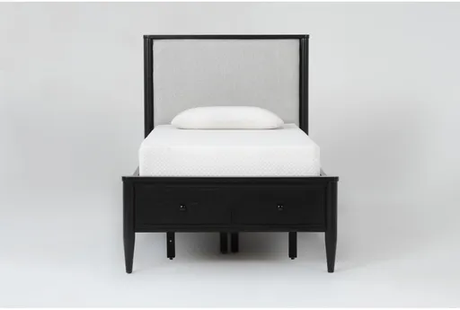 Introducing the Austen Black Twin Wood Upholstered Platform Bed, a stunning addition to any kid's bedroom. This traditional bed combines classic style with modern functionality, featuring a sleek black finish that complements a variety of decor styles. The bed is designed with built-in storage drawers in the footboard, providing convenient extra space to keep your room organized.