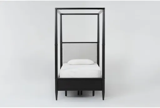 As part of a complete whole-home collection that was developed entirely by Living Spaces, the Austen canopy bed reflects a unique and thoughtful approach to design. With a refined all-American look and extensive functionality, this piece is a natural and purposeful addition to your bedroom. A textured black finish accentuates oak veneer and solid wood, while an upholstered headboard provides soft support. Stately and elegant, long, turned and tapered posts distinguish the frame. We offer options with and without storage, so you can enjoy no storage, side storage, footboard storage, or side and footboard storage.