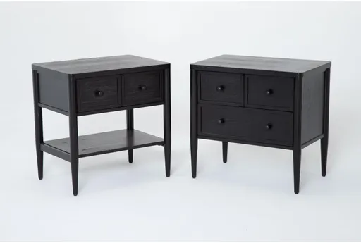 The Austen Black Wood 1-Drawer & 3-Drawer Nightstand With USB Set Of 2 by The Essentials combines style and functionality for your bedroom. Crafted with oak veneer and solid rubberwood, these nightstands offer ample storage space and modern conveniences. The built-in USB ports ensure your devices stay charged and within reach. Set of 2 nightstands with 1-drawer and 3-drawer options. Includes USB ports for easy device charging. Constructed from oak veneer and solid rubberwood.
