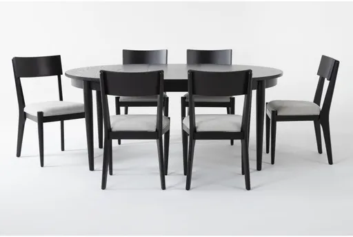 Enhance your dining experience with the Austen Black Wood 54-72" Round to Oval With Grey Upholstered Chair II Set For 6. This stylish set is perfect for both dining rooms and kitchens, offering a timeless design that will complement any traditional décor. The extending table transitions seamlessly from a round to an oval shape, providing versatile seating options for family and guests.