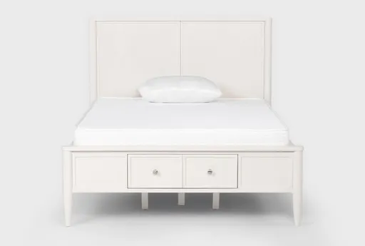 The Austen White Full Wood Panel Bed with Footboard Storage combines traditional style with practical functionality. This full-sized bed features a pristine white finish that adds a soft and neutral touch to any bedroom. Crafted from oak veneer and solid rubberwood, it offers durability and timeless appeal.
