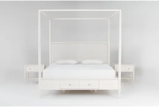 Transform your bedroom into a serene retreat with the Austen White King Footboard Storage Wood & Upholstered Platform Canopy 3 Piece Bedroom Set. This set includes a king-sized canopy bed with a footboard storage compartment and two 1-drawer nightstands, offering ample storage and a cohesive look. Crafted from oak veneer and solid rubberwood, this traditional design combines functionality with timeless style.