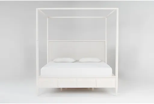 Transform your bedroom into a serene retreat with the Austen White King Wood & Upholstered Platform Canopy Bed. This traditional four-poster bed combines style and functionality. Crafted from durable rubberwood with an oak veneer finish, this canopy bed offers a timeless, coastal-inspired look that fits seamlessly into any decor. Features a canopy and platform design for added elegance and style. Modern traditional style in a versatile white finish. Constructed from solid rubberwood with an oak veneer and upholstered fabric.