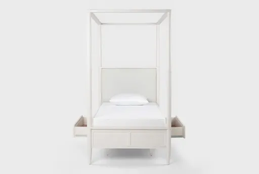 The Austen White Twin Wood & Upholstered Canopy Bed With Side Storage is a perfect addition to any kids' room. Crafted from oak veneer and solid rubberwood, this twin-size canopy bed combines functionality and style. The neutral grey fabric complements the white wood, making it a versatile choice for various bedroom themes.