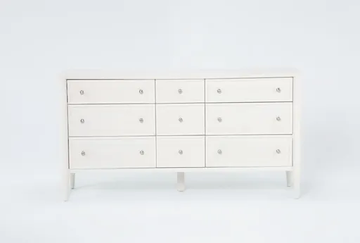 The Austen White Wood 9-Drawer Dresser brings timeless traditional character to bedrooms, nurseries, and kids rooms while keeping storage clean and accessible. Its rectangular horizontal profile and painted white finish create a bright, neutral backdrop that complements cottage, coastal, and traditional decor. Oak veneer accents and wood details introduce subtle grain and warmth without overwhelming smaller spaces, making this dresser a practical small space solution for apartments and shared rooms.