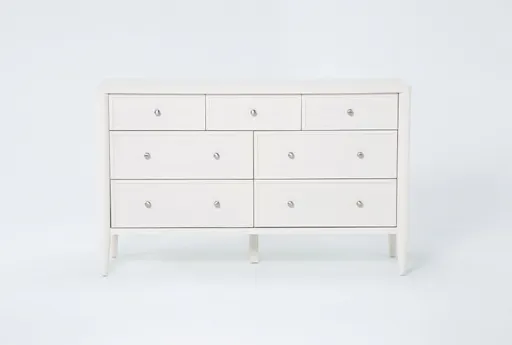 As part of a complete whole-home collection that was developed entirely by Living Spaces, the Austen White 7-drawer dresser reflects a unique and thoughtful approach to design. With a refined all-American look and extensive functionality, this piece is a natural and purposeful addition to your bedroom. A textured warm white finish accentuates oak veneer and solid wood, while zinc knobs nod to antique inspiration. Stately and elegant, long, turned and tapered posts distinguish the frame. You’ll enjoy felt-lined top drawers that protect delicate items and cedar-lined bottom drawers that repel moths and insects and keep clothes fresh by eliminating mildew.