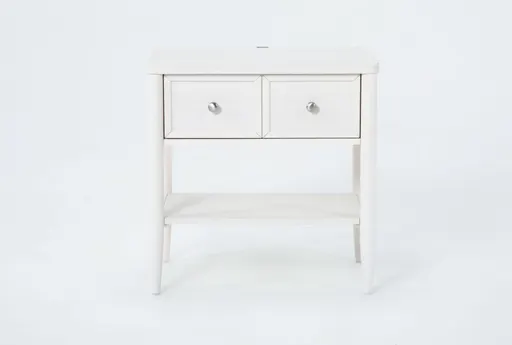 The Austen White Wood 1-Drawer Nightstand with USB is a perfect blend of traditional style and modern functionality. Crafted from oak veneer and solid rubberwood, this nightstand features a soft white color that complements any bedroom decor. The built-in USB port ensures your devices are always charged and within reach.