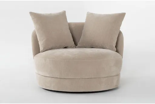 The Avaya Beige Fabric Wicker Swivel Barrel Chair brings a modern, rounded silhouette to small rooms while offering a relaxed, plush feel. Upholstered in soft beige fabric with woven natural wicker accents and a loose reversible back, this armless lounge chair reads as both contemporary and approachable. Deep-seated cushions feature dacron wrapped cushion layers with a polyurethane foam core for supportive comfort that keeps its shape. A smooth swivel base and symmetrical round profile make the piece a versatile modern living room furniture option and a smart small space solution.