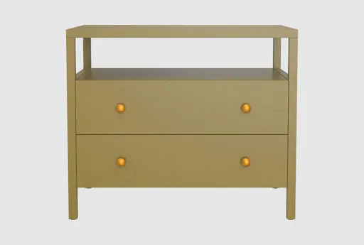 The Averie Olive Wood 2-Drawer Nightstand pairs modern form with smart storage to suit compact bedrooms, dorms, and nurseries. Its clean rectangular profile, tapered legs, and soft edge paneling reflect scandinavian-inspired modern design, while a matte olive green finish and subtle gold knobs add a warm, contemporary note. Oak veneer surfaces reveal a textured wood grain that brings natural warmth without visual heaviness, and the open shelf plus two drawers give flexible organization for books, toys, and personal items. Built with wood components and veneered surfaces that prioritize structural integrity, this nightstand is a reliable small space solution for everyday living.