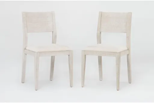 The Avila Distressed White + Cream Upholstered Dining Chair Set of 2 adds a rustic charm to your dining area. Made from solid, sustainably sourced rubberwood and 100% polyester fabric, these armless chairs bring both style and sustainability to your home. Perfect for the dining room or kitchen, they offer a comfortable seating experience with a touch of eco-friendly design.