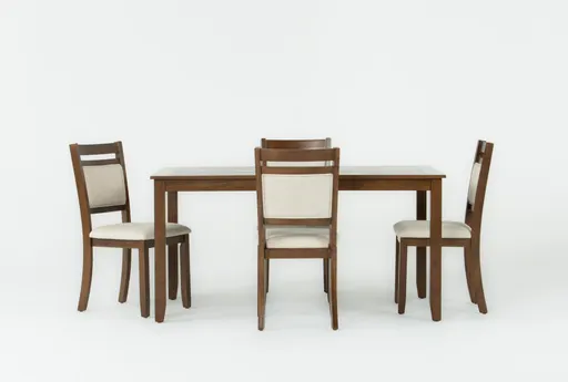 Avina Dark Brown Wood 60-inch Dining Table + Cream Upholstered Chairs Dining Set For 4 brings a modern silhouette to compact dining spaces, pairing a 60-inch rectangular table with four cream upholstered ladder-back chairs. A warm dark brown finish highlights smooth wood and elm veneer surfaces while clean lines and tapered legs keep the profile light in a small dining area. The chairs are upholstered in polyester fabric with foam-padded seats that offer supportive, comfortable dining for everyday use. This compact dining set is a smart small space solution for apartments, condos, and breakfast nooks where modern dining furniture and casual entertaining meet.