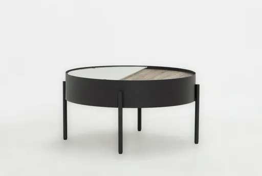 Azella Black 34" Round Metal & Wood Coffee Table pairs a 34-inch round glass inset with a black metal frame and an MDF skirt finished in paper laminate to bring practical modern function to the living room. The glass tabletop sits flush inside the metal rim for easy cleaning, while the MDF and metal legs provide steady support for daily use. Sized to center seating areas, it holds drinks, books, and decorative pieces without crowding the room.