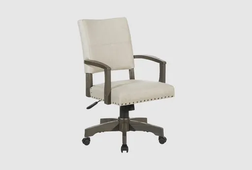 The Banks Traditional Grey 26" Office Chair With Wheels combines classic traditional style with modern functionality. Upholstered in a sophisticated antique grey and ivory polyester fabric, this chair is designed to provide both comfort and elegance. The solid wood armrests and tailored French seam with nailhead trim details add a touch of timeless charm to any office space.