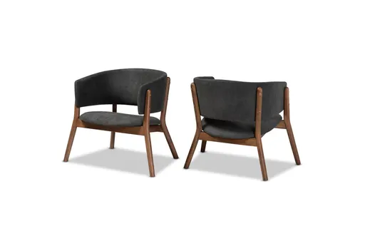 The Baron Mid-Century Modern Dark Grey Fabric Upholstered and Walnut Brown Finished Wood 2-Piece Living Room Accent Chair Set pairs a rounded mid-century modern silhouette with walnut brown finished rubberwood legs for a warm, grounded look that fits living rooms and reading nooks. Seats are upholstered in 100% polyester fabric with PU foam cushions for supportive everyday comfort, while MDF components add structural stability. The open back and angled legs create an airy profile that makes these chairs easy to position as a focal point or extra seating near a sofa or desk.