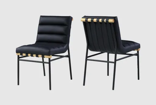 The Barten Black Vegan Leather Fabric Dining Chair with Black Leg Finish is a perfect addition to any modern dining room or kitchen. This armless set of 2 chairs combines style and comfort, crafted from durable vegan leather and supported by sturdy iron legs with an oak veneer finish. Modern design with a sleek black finish. Set of 2 armless chairs for versatile seating. Durable vegan leather and iron construction.
