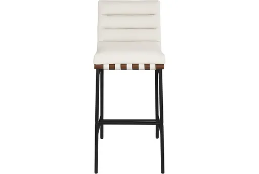 Introducing the Barten Cream Vegan Leather Fabric Upholstered 40.5" Barstool With Black Leg Frame. This modern barstool features a sophisticated cream color and an armless design, making it a versatile addition to your dining room or kitchen. Its sturdy black leg frame provides reliable support and complements the neutral tones of the seat.